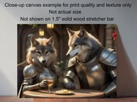 This engaging anthropomorphic wolf couple is extremely human like. This image of this humanoid wolf couple eating and drinking at a table outside a tavern, wearing body armor, and looking like the true warriors they are - even when they are at play, is available in multiple print sizes and multiple canvas wrap sizes.